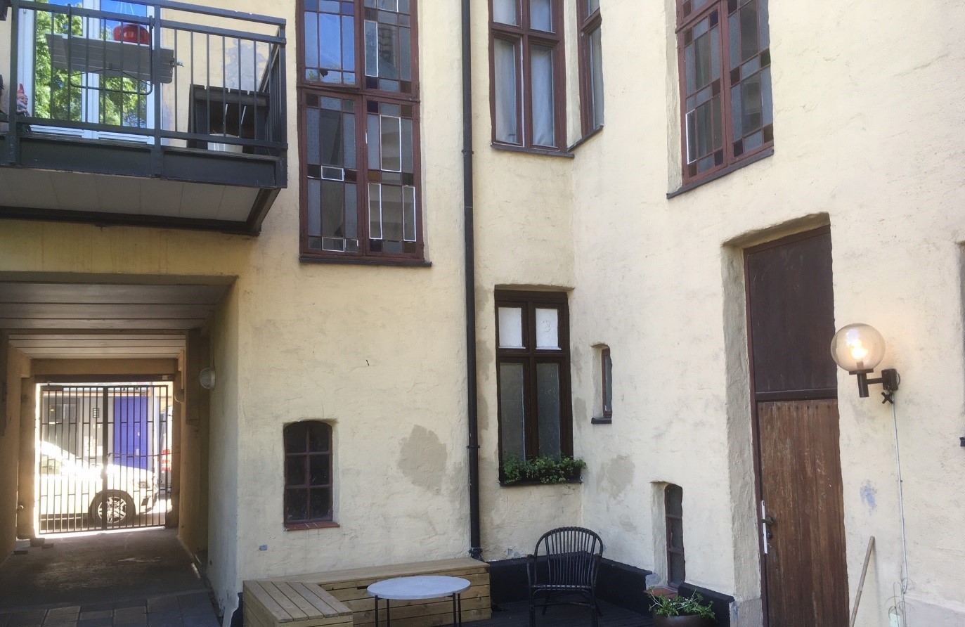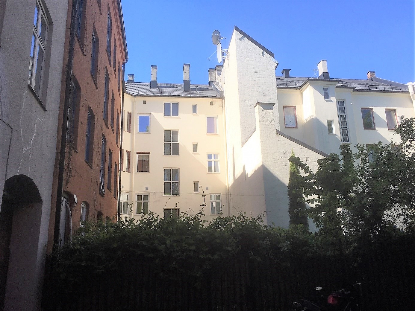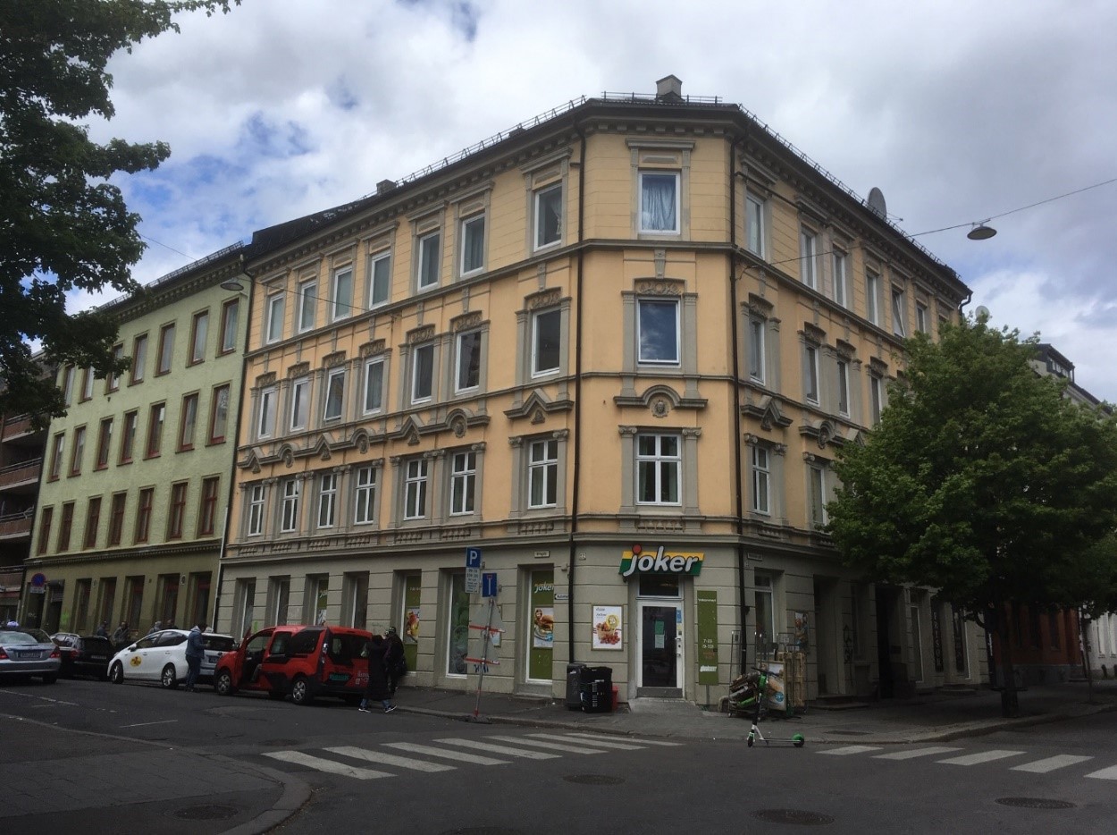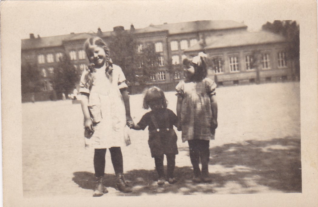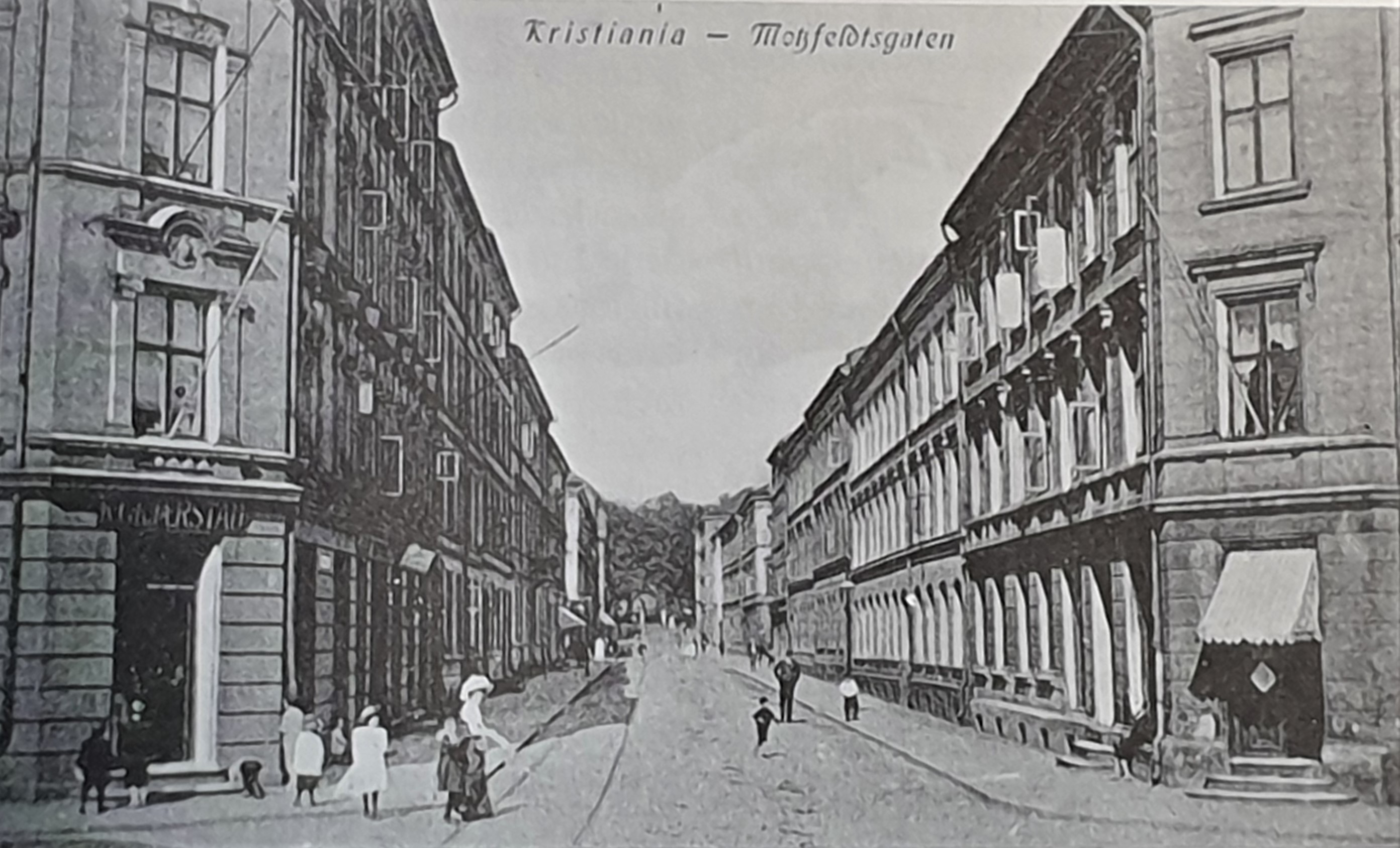 Da jeg vokste opp på 1950- og 1960-tallet, var mor og jeg ofte på besøk i Motzfeldtsgata 18 (bare kalt «Atten» i min familie) der min morfars nære familie hadde bodd siden 1907. Min mor Gudrun Ruud ble født i 1918 i Motzfeldtsgata 14 der hun også vokste opp. I bakgården til Motzfeldtsgate 18. De to jentene bak er fra venstre Erna Fjeld og min mor Gudrun Ruud. Foran mors fetter Rolf Johannesen. Foto fra slutten av 1920-tallet.Hun ble i likhet med sin eldre søster Grete født hjemme. Begge ble hjulpet inn i verden av jordmor Beate Mathiesen som var gift med kunstmaler Håkon Mathiesen og som bodde i nabogården Motzfeldtsgate 12. Les mer under artikler/historier.