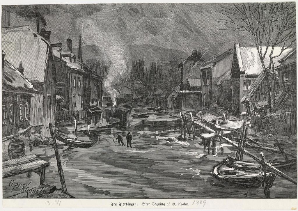 Bilde fra Akerselva og Fjerdingen til venstre: Xylografi etter Olaf Thon, 1899. Oslo Museum.